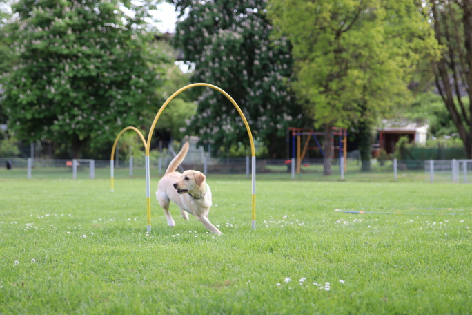 Im Training lernt der Hund Schritt für Schritt die einzelnen Geräte kennen und wie er sie auf Signal durchlaufen soll. Parallel wird der Mensch in Körpersprache, Sicht-
